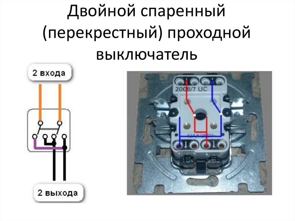 А у третьих входов и выходов по два. Последние предназначены для схем не с двумя, а несколькими точками включения света.