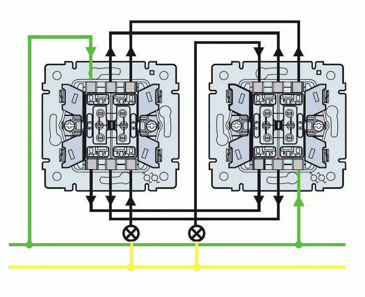 При реализации выходы обоих переключателей соединяются парой жил с получением двух раздельных питающих цепей. Затем на вход одного коммутирующего изделия подсоединяется провод с фазой, а на вход второго – отвод до лампочки.