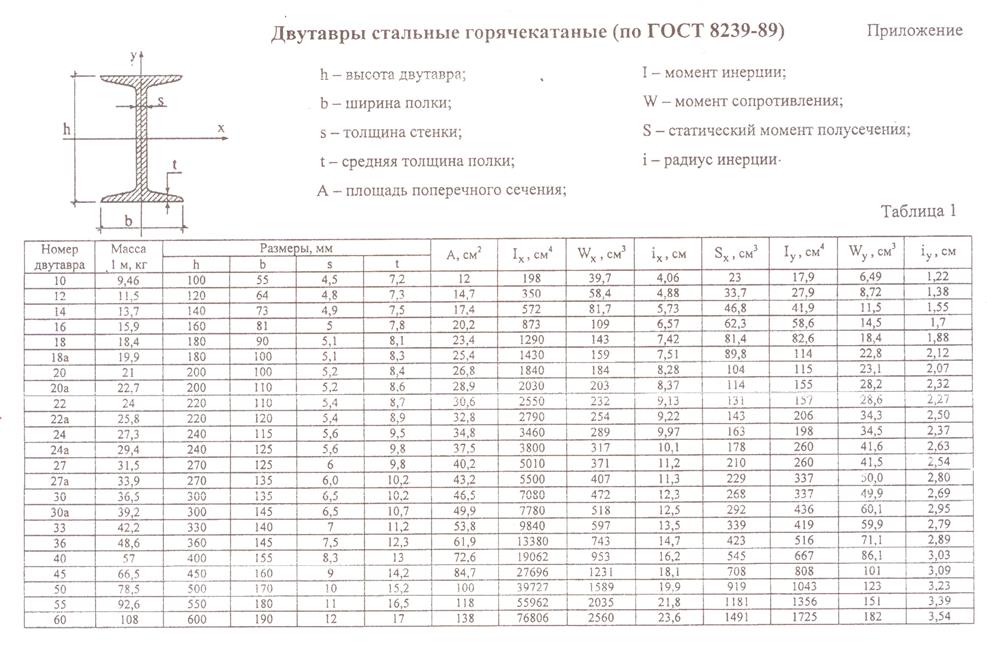 Размеры и масса двутавра (ГОСТ 8239-89)