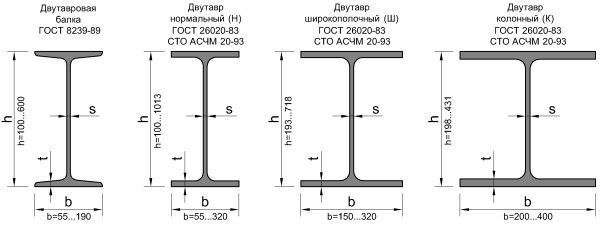 Индекс Б — нормальные двутавры 20Б, 25Б, 30Б, 35Б, 40Б, 45Б, 50Б, 55Б, 60Б, 70Б.