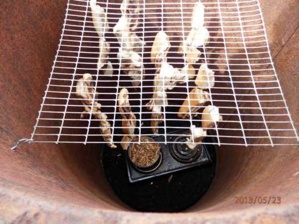 Π Π²Π΅ΡΡ Π½Π΅ΠΉ ΡΠ°ΡΡΠΈ Π±ΠΎΡΠΊΠΈ/ΡΡΡΠ±Ρ, ΠΎΡΡΡΡΠΏΠΈΠ² ΠΎΡ Π²Π΅ΡΡ Π½Π΅Π³ΠΎ ΠΊΡΠ°Ρ 10-5 ΡΠΌ, ΡΠ²Π΅ΡΠ»ΠΈΠΌ ΡΠ΅ΡΡΡΠ΅ ΠΎΡΠ²Π΅ΡΡΡΠΈΡ. Π Π°ΡΠΏΠΎΠ»ΠΎΠΆΠ΅Π½Ρ ΠΎΠ½ΠΈ Π΄ΠΈΠ°ΠΌΠ΅ΡΡΠ°Π»ΡΠ½ΠΎ ΠΈΠ»ΠΈ Π΄ΡΡΠ³ Π½Π°ΠΏΡΠΎΡΠΈΠ² Π΄ΡΡΠ³Π°. Π Π½ΠΈΡ ΠΏΡΠΎΠ΄Π΅Π²Π°Π΅ΠΌ ΡΡΡΡΠΈ. ΠΠΎΠΆΠ½ΠΎ ΠΌΠ΅ΡΠ°Π»Π»ΠΈΡΠ΅ΡΠΊΠΈΠ΅ ΠΏΡΡΡΡΡ, ΠΌΠΎΠΆΠ½ΠΎ β ΠΏΠ°Π»ΠΊΠΈ. ΠΡΠ±ΠΎΡ Π·Π°Π²ΠΈΡΠΈΡ ΠΎΡ Π²Π΅ΡΠ° ΡΠΊΠ»Π°Π΄ΡΠ²Π°Π΅ΠΌΡΡ ΠΏΡΠΎΠ΄ΡΠΊΡΠΎΠ² ΠΈΠ»ΠΈ ΡΠΎΠ³ΠΎ, ΡΡΠΎ ΠΈΠΌΠ΅Π΅ΡΡΡ Π² Π½Π°Π»ΠΈΡΠΈΠΈ. Π‘Π°ΠΌΠΈ ΠΏΡΡΡΡΡ ΠΌΠΎΠ³ΡΡ ΡΠ°ΡΠΏΠΎΠ»Π°Π³Π°ΡΡΡΡ Π½Π°ΠΊΡΠ΅ΡΡ ΠΈΠ»ΠΈ ΠΊΠ°ΠΊ Π΄Π²Π΅ ΠΏΠ°ΡΠ°Π»Π»Π΅Π»ΠΈ, ΡΠ°ΡΠΏΠΎΠ»ΠΎΠΆΠ΅Π½Π½ΡΠ΅ ΠΏΡΠΈΠΌΠ΅ΡΠ½ΠΎ Π½Π° 1/3 Π΄ΠΈΠ°ΠΌΠ΅ΡΡΠ° ΠΊΠΎΡΠΏΡΡΠ° ΠΊΠΎΠΏΡΠΈΠ»ΡΠ½ΠΈ. Π‘Π²Π΅ΡΡ Ρ Π½Π° ΡΡΡ ΠΎΠΏΠΎΡΡ ΡΠΊΠ»Π°Π΄ΡΠ²Π°Π΅ΠΌ ΡΠ΅ΡΠΊΡ, Ρ ΠΏΡΠΈΠΊΡΠ΅ΠΏΠ»Π΅Π½Π½ΡΠΌΠΈ ΡΠ½ΠΈΠ·Ρ ΠΏΡΠΎΠ΄ΡΠΊΡΠ°ΠΌΠΈ. ΠΠΎΠΏΡΠΈΠ»ΡΠ½Ρ ΠΏΡΠΈΠΊΡΡΠ²Π°Π΅ΠΌ ΡΠ°Π½Π΅ΡΠΎΠΉ ΠΈΠ»ΠΈ Π»ΠΈΡΡΠΎΠΌ ΠΌΠ΅ΡΠ°Π»Π»Π°.