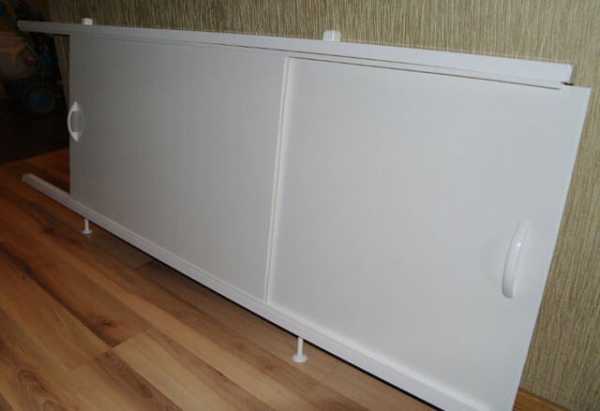 Если будет устанавливаться покупной экран и есть возможность выбора между алюминиевой рамкой и деревянной, предпочтение отдается алюминию из-за его легкости, коррозийной устойчивости и высокой прочности. Для ее заполнения рекомендуются раздвижные пластиковые дверцы из плит ПВХ с никелированными ручками.