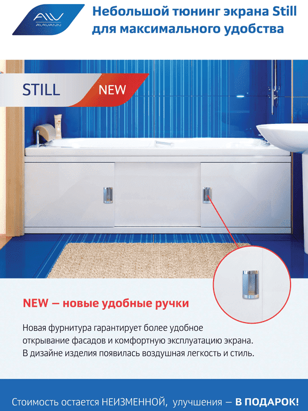 Смущает высота изделия? Этот размер экрана под ванну также меняется. Достаточно отрегулировать высоту ножек, которые поставляются в комплекте.
