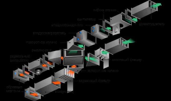 В отличие от традиционных способов комплектации элементов системы в качестве шахты сегодня часто применяются пластиковые воздуховоды. Унифицированные соединения дают возможность собрать устройство самостоятельно. Главное правильно выбрать компоненты систем вентиляции, их взаимную совместимость и обеспечить достаточную производительность устройства. Более надежным, но трудоемким при монтаже являются металлические элементы. Трубы и короба из оцинкованной стали требуют навыков от мастера. Предлагается на рынке и более редкая сегодня продукция — элементы воздуховодов из текстиля и алюминия. Из чего бы ни была сделана система, состоит она из базовых элементов.