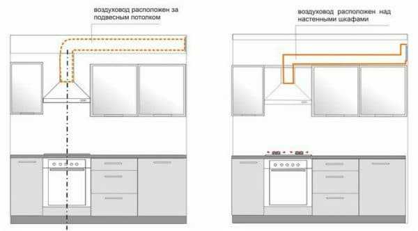 Монтаж вытяжной конструкции производится либо на поверхность стены, либо на нижний край кухонного шкафа. В обеих ситуациях требуется обеспечение прокладывания воздуховода от корпуса вытяжного устройства до входа в общедомовую систему вентиляции. На кухне многоквартирных домов такая обязательно имеется. При обустройстве вытяжного устройства в индивидуальном секторе потребуется заблаговременно провести на улицу воздуховод. Сделать это возможно как сквозь внешнюю стенку, так и по межэтажным перекрытиям на чердак и кровлю.