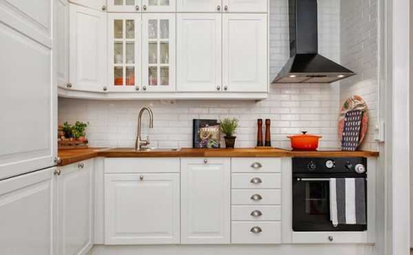 - Ширина, а вернее длина фартука. В большинстве случаев она обусловлена длиной столешницы, но если кухонная мебель располагается между двумя стенами, то фартук обычно заворачивают и доводят его с одной стороны до края оконного откоса, а с другой – до двери кухни. Мало того, на этих расстояниях (на боковых придатках фартука), там где нет мебели, плитку опускают до самого пола.