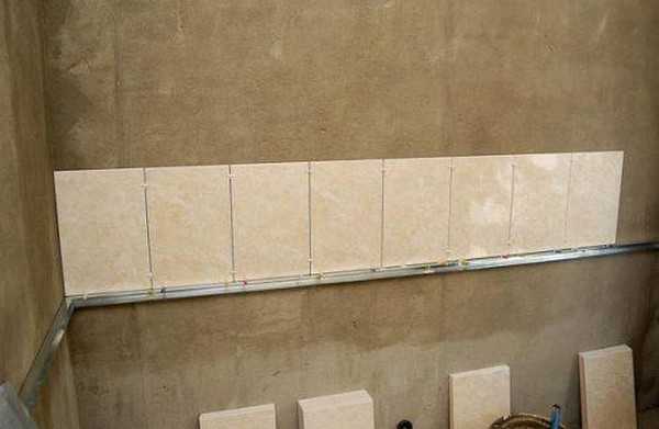 - Укладываем первый ряд плитки. Начинаем с самой длинной стены и контролируем каждую плитку уровнем – первый ряд должен быть идеальным, и именно по этой причине проверять нужно не только ее вертикальность, но и плоскость по горизонту. Особое внимание уделяем перепадам по высоте между соседними плитками – их быть не должно. Ширину шва контролируем крестиками, устанавливая их по паре в каждый шов.