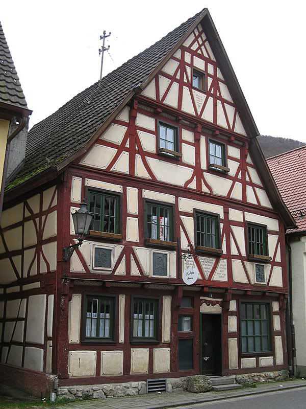 ▫ Южно-германская готика или алеманская. Относится к юго-западной немецкой архитектуре. Дома отличаются высокой кровлей, объединяющей под собой два и более наклонных уровня. Обязательны парные ригели и вертикальные стойки.