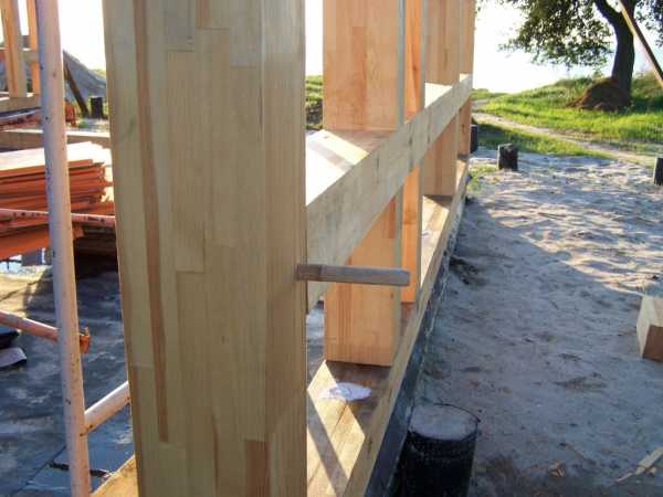 Внутренние перегородки выполняются также из бруса 150х150 мм, прикрепляются дюбелями. Поверх брусьев, расположенных вертикально, устанавливаются продольные прогоны, к которым закрепляются деревянные перекрытия.