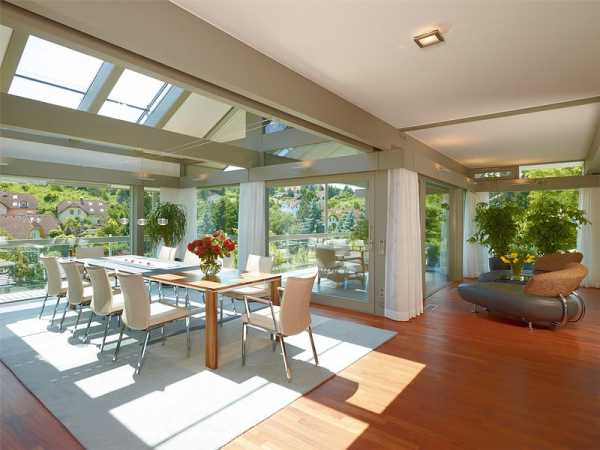 Во-первых, захватывается много дневного света. Во-вторых, размеры комнаты простираются до ближайших деревьев, или до самого горизонта — в зависимости от местоположения дома. И обратный эффект — внешний вид становится частью интерьера.