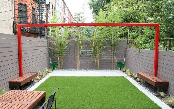 Там, где будут обустраиваться лестницы или горки, нужно будет оставить небольшой участок, чтобы ребенок мог по нему разбежаться. Стоит подумать о безопасности и в случае, если вы будете устанавливать качели. Ширина области должна быть порядка двух метров.