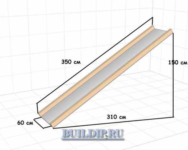 Длина горки вычислялась исходя из высоты площадки. Необходимо было добиться небольшого уровня наклона, чтобы избежать несчастных случаев. Ширина горки равна ширине стартового участка. Для безопасного скольжения по всей длине крепится ограждение в виде перил, и планкой закрываются места крепления металла к дереву. Металл следует крепить внахлест, сверху вниз, чтобы стык при скатывании с горки был менее заметным.