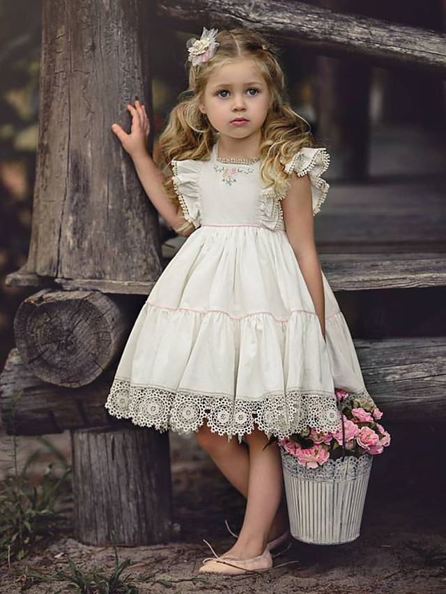 Улыбающаяся милая девочка 3-4 лет в стильном платье с цветами на цветущем ромашковом лугу под открытым небом. детство. летний сезон.ПРЕМИУМ