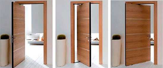 - Рото-дверь может открываться в разные стороны благодаря специальному поворотному механизму. Однако такая модель неудобна тем, что занимает больше места, чем обычные раздвижные конструкции.