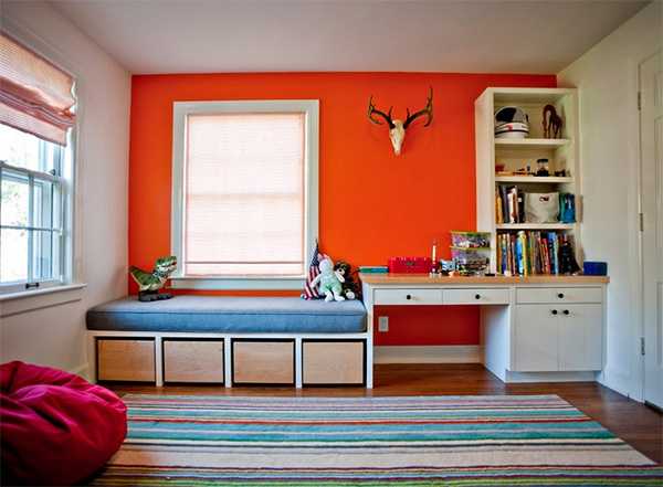 Центральная задача в интерьере детской школьника: рационально организовать место для занятий, с удобным письменным столом и освещением. Цвета мебельного гарнитура могут быть жизнерадостными и привлекательными, чтобы помогали сосредоточить внимание и заодно поднять настроение.