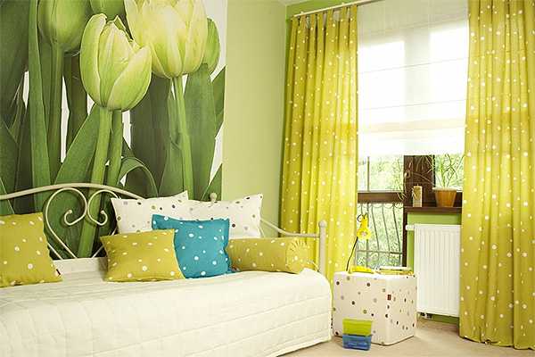Что касается занавесок, то они должны быть довольно плотными, чтобы затемнить комнату во время сна, и при этом легкие, не позволяющие застаиваться воздуху. Шторы могут выполняться из контрастной яркой ткани, но они должны иметь лаконичный фасон — тяжелые тканевые драпировки будут неуместны, поскольку сильно накапливают пыль. В комнате малышей или девочек постарше также можно использовать симпатичные декоративные подушки — их можно размешать на кресле или кроватке.