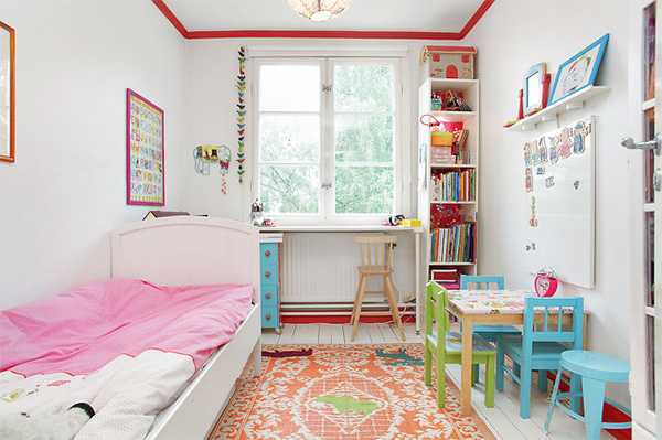 Создавая дизайн детской комнаты, критически оцените размер пространства. На первый взгляд, маленькая детская может служить только спальней — организовать здесь же игровую зону и учебно-рабочее место для вашего школьника может быть непросто, но возможно! Например, проектируя комнату для двоих, вы можете сэкономить место, задействовав второй уровень с помощью установки двухъярусной кровати. Или же имея одного ребенка, следует рассмотреть кровать-чердак, под которой легко поместится вместительный шкаф или небольшой диван, а вот стол для уроков лучше под кровать не ставить — подвиньте его ближе к окну. Если вы затеяли ремонт в комнате для двух детей, позаботьтесь о том, чтобы у каждого из них было свое личное пространство. Пусть даже речь идет о необычно оформленной стене рядом с изголовьем кровати.