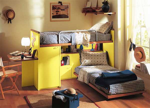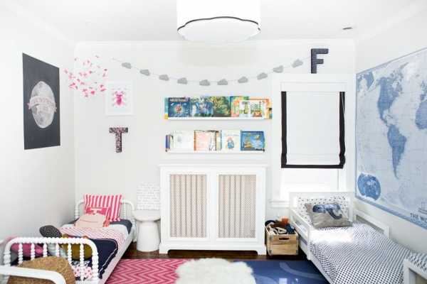 Основная проблема дизайна комнаты для двух девочек или двух мальчиков – сохранение пространства. В остальном можно выдерживать одну линию в мебели, цветовой гамме, системах хранения, декоративных элементах. А вот комната для разнополых детей потребует больше фантазии. Здесь необходимо детальное зонирование пространства и индивидуальный подход к каждому ребенку. Объединить этот инь и янь можно с помощью цветов. Например, на желтом покрывале девичьего дивана размещаем синие подушки, а на мальчиковой синей стене висят плакаты в желтых рамах.