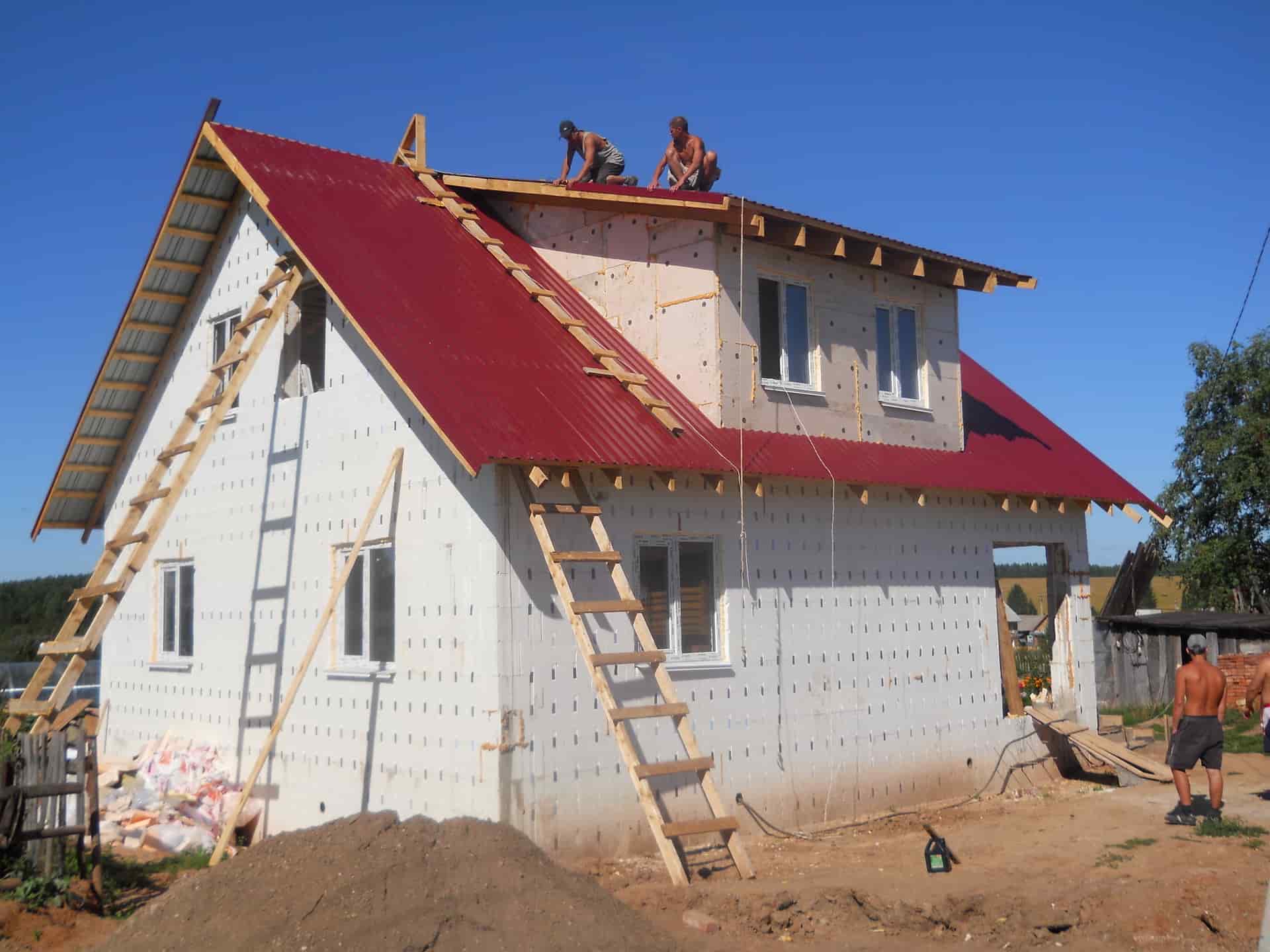 Монтируются стропила крыши, ригели и подкосы для нее. Обрешетка выполняется из доски 100х25 мм с зазорами 20 см между ними. Укладывается она ондудилином, металлочерепицей или профлистом. Каркас дома утепляется, прокладывается паро- и ветрозащита и обшивается доской 16 мм или фанерой.