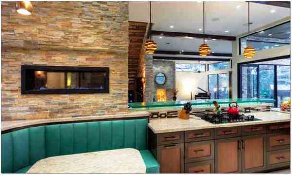 Этот дорогостоящий, но оправдывающий вклад вариант, станет прекрасным дополнением интерьера кухни. Камень – материал благородный, натуральный и долговечный, с его помощью можно легко добиться атмосферы тепла, роскоши и гармонии. Данный вид отделки не рекомендован для рабочей зоны ввиду сложности ухода за камнем.