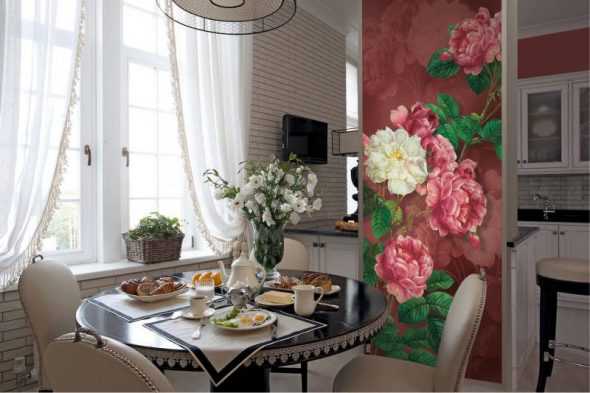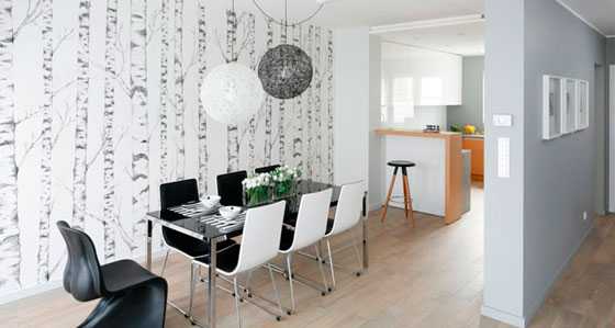 Контрастные обои хорошо смотрятся на одной из стен и зрительно зонируют обеденную зону