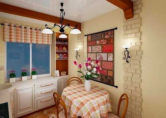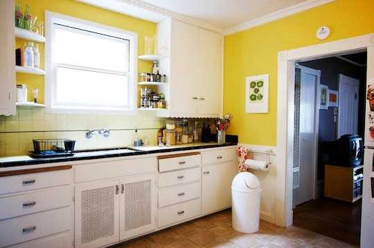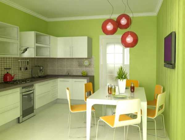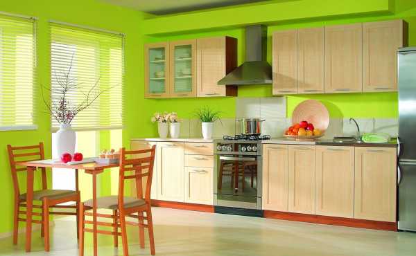 Темный зрительно сужает помещение, светлый делает комнату светлее и больше. Кухня в форме прямоугольника визуально уравновешивается, если ее стены покрашены в разные тона одного цвета. Короткие – темнее, длинные – светлее. Если на кухне низкий потолок, то стену около кухонного стола красят в яркие вертикальные полоски или изображают подобие ниши.