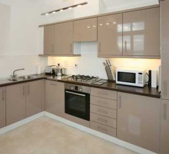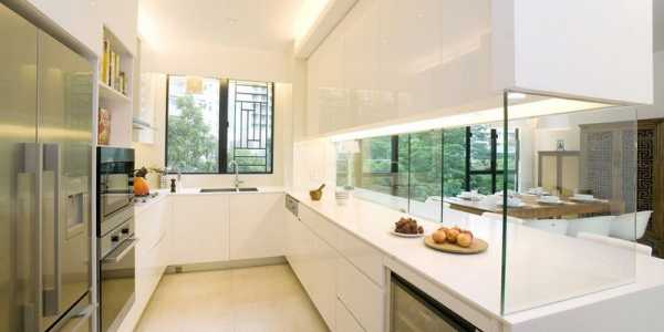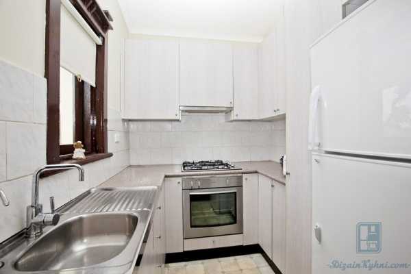 Светлые фасады и такого же цвета стены визуально расширяют кухню.Важная роль отводится выбору напольного покрытия. Основной задачей отделки кухни является визуальное расширение помещения. Если вы решили использовать напольную плитку, можно её уложить по диагонали.
