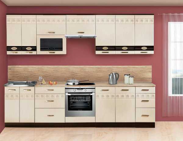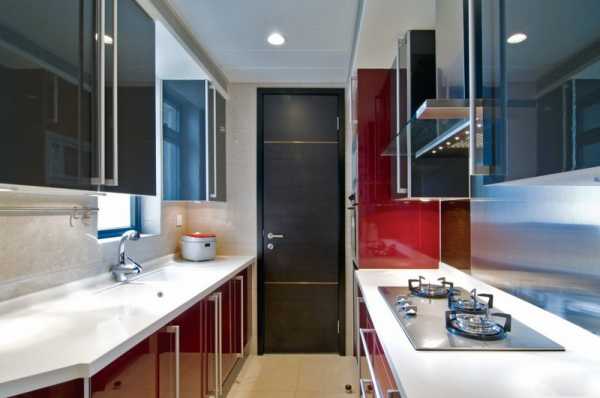Мебель в узкой кухне также будет смотреться лучше со светлыми фасадами. Однако это не является аксиомой. Прекрасно будет выглядеть и комбинированный вариант, когда нижние шкафы выполнены в глубоком ярком свете, а фасады верхних — более светлые.