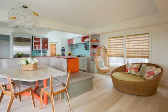 Часто дизайнеры используют контрасты красок и материалов. Например, рабочая зона нейтрального тона хорошо гармонирует с ярким столом и стульями.