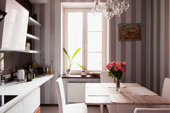 Вертикальная полоска на кухне смотрится свежо и зрительно добавляет высоты помещению
