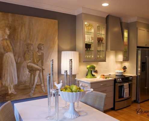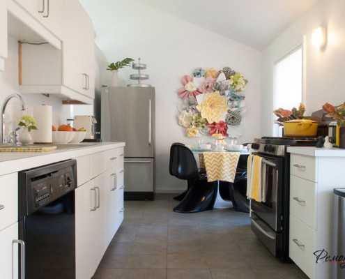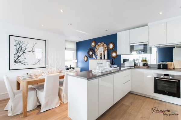 Кухня часто упускается из виду, как место для демонстрации произведений искусства и гобеленов, но глухая стена в ней станет идеальным местом для оформления вышеуказанными элементами интерьера, которые обеспечат элегантный вид и красоту. Такую стену целесообразно оформить фотографиями или детскими рисунками.