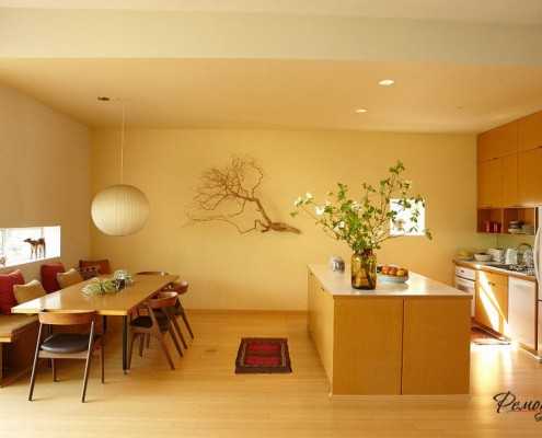 Тем не менее, если остальная часть кухонных стен имеет теплый цвет, выбор в пользу прохладной тени, как кобальта или шалфея на стене за столом будет незаменимым для поразительного контраста.