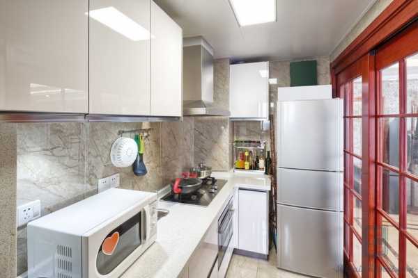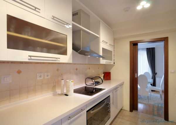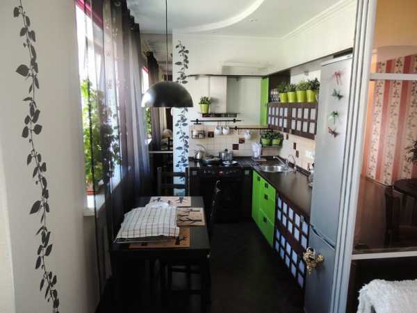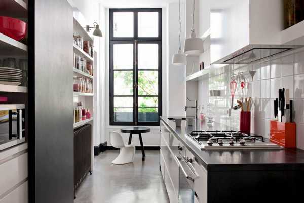 Самый печальный вариант — очень узкая кухня. В такой невозможно даже совместить обеденную зону с вытянувшимся вдоль одной стены гарнитуром. Холодильник ставится в один ряд с гарнитуром, обычно около входа.