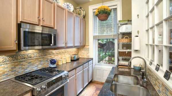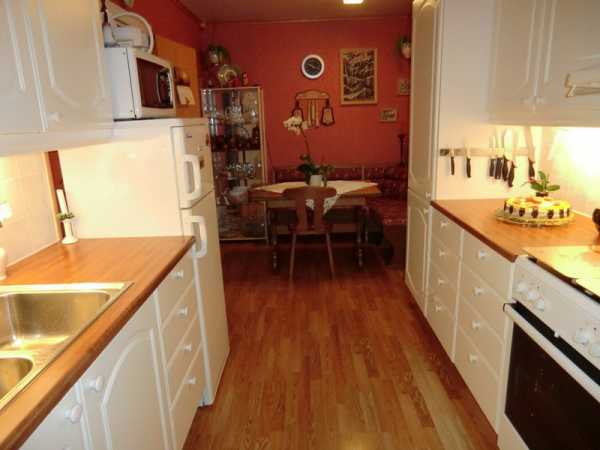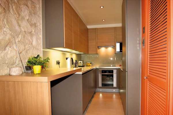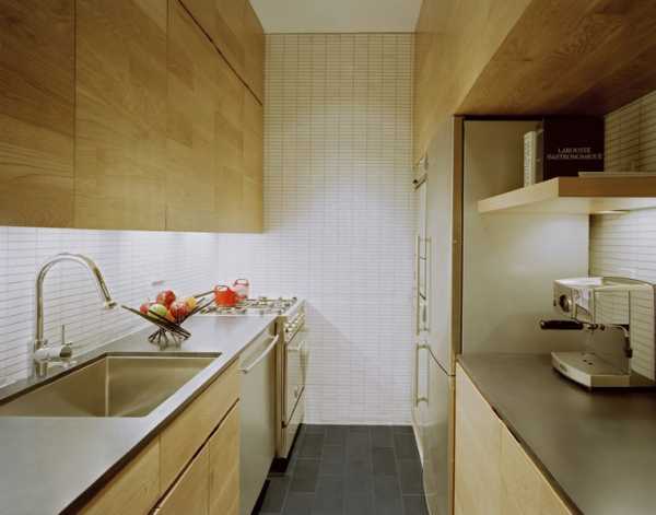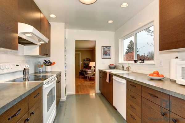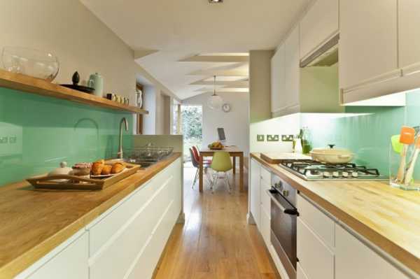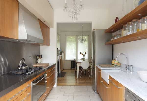 Если используется ламинат, укладывать его нужно перпендикулярно самой длинной стене. Темный цвет пола добавит немного глубины и высоты помещению, а светлый — осветлит восприятие длинного тоннеля кухни.