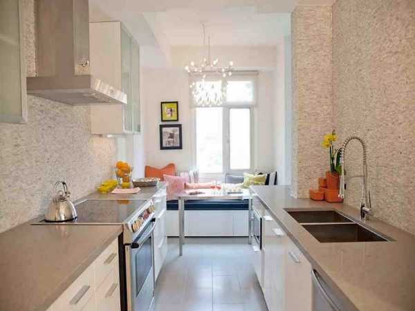 Чтобы длинная кухня не выглядела излишне мрачной стоит отдать предпочтение обоям пастельных тонов. Хорошо будет смотреться белый цвет в молочном оттенке, а также персиковые и кремовые тона.