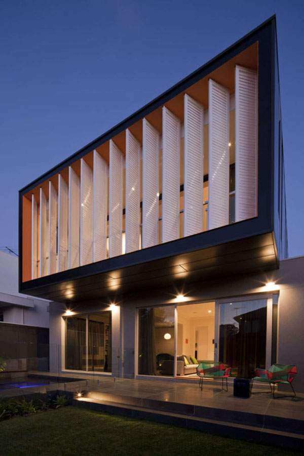 Белые ставни расположены под фиксированным углом и позволяют комнатам наверху открывать вид на окрестности, сохраняя при этом чувство уединения.