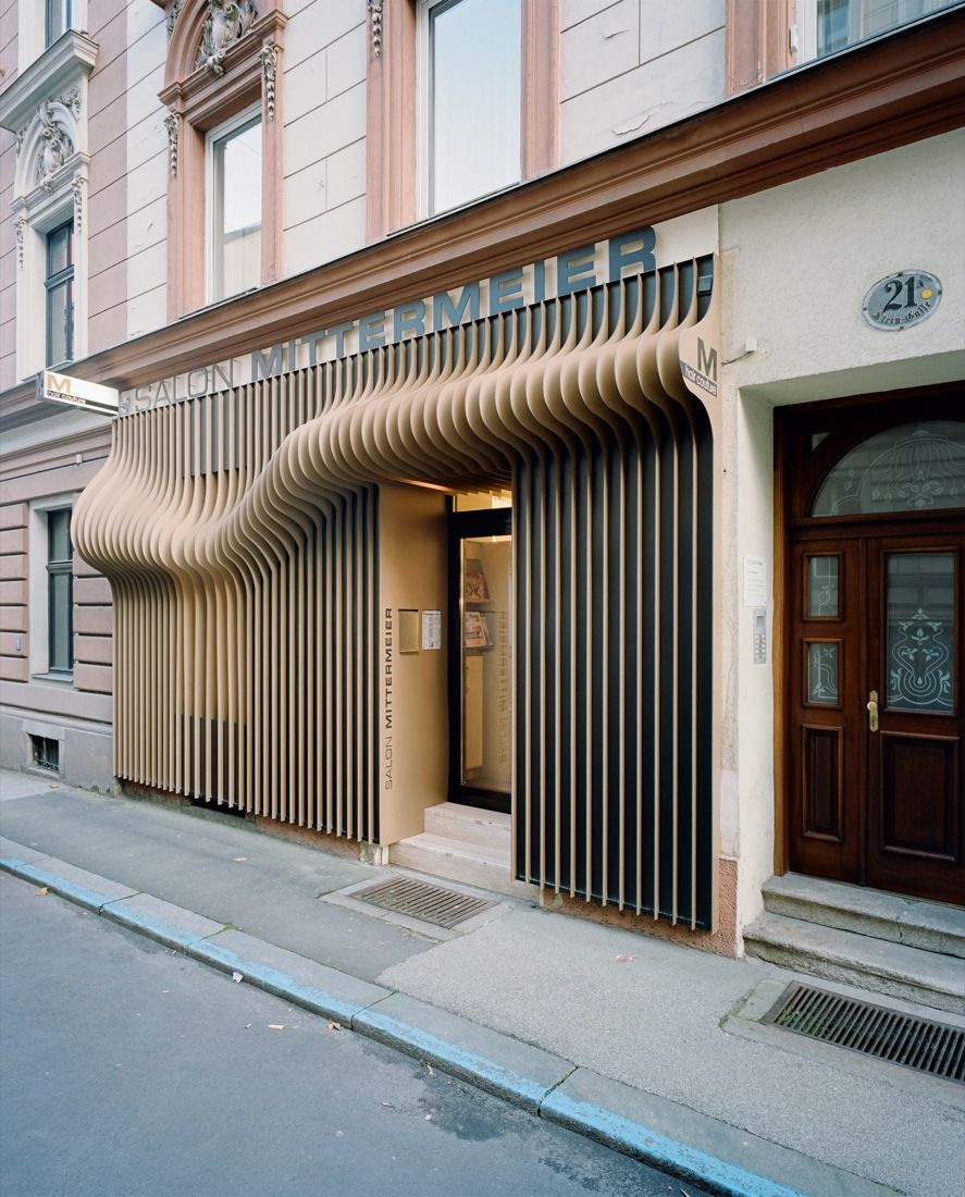 Эта парикмахерская, спроектированная x Architekten, имеет фасад, который служит вывеской магазина и привлекает внимание своим динамичным дизайном.