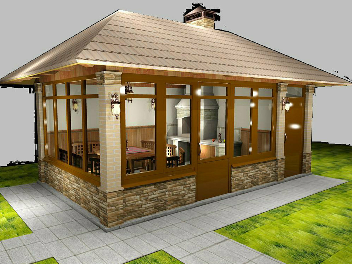 Беседок закрытого типа также существует множество. Обычно для их обустройства отводится веранда жилого дома или строится отдельно стоящая пристройка. Обычно такие кухни представляются собой небольшие домики со стеклянными окнами в пол, которые в жаркое время года раздвигаются. Зимой закрытые летние кухни обогреваются печью.