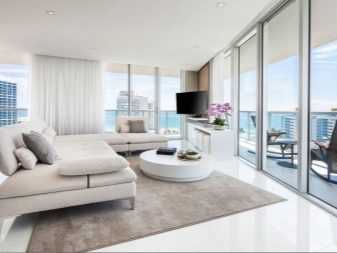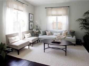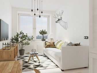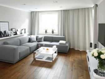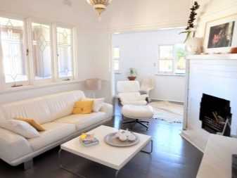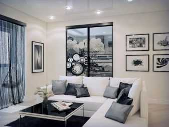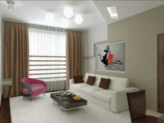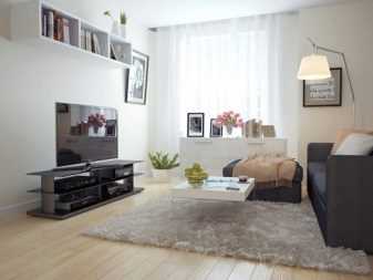 Зал небольшого размера допустимо отделывать также в духе минимализма. Размещайте только исключительно нужные вещи, откажитесь от малейших украшений, ставьте мебель в компактном исполнении и максимально современную бытовую технику – больше ничего для соблюдения концепции не потребуется. Интерьер чаще всего делают монотонным, и лишь изредка добавляют второй цвет к доминирующей окраске.