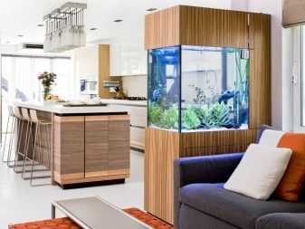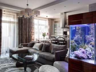 Рекреационную зону стоит обособить от столовой; в другом варианте от общего пространства гостиной отделяется детская. Важным инструментом зонирования выступает мебель: что немаловажно, такой прием не воспринимается как искусственный или нелепый поступок. Вовсе не обязательно ставить громоздкие шкафы, хватает для разграничения пространства обыкновенных диванов, барных стоек, плоских аквариумов и полок из гипсокартона.