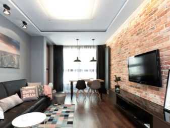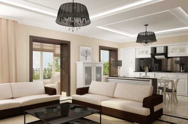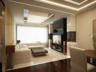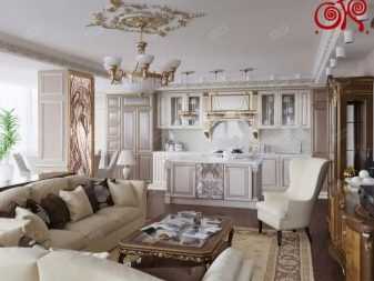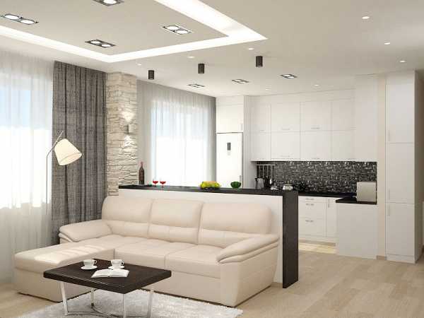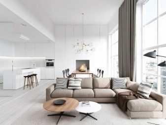 Иногда вместо разделения самой гостиной на части ее пытаются объединять с другими комнатами. Особенно актуален такой ход в однокомнатной квартире, где даже небольшие границы между помещениями отнимают ощутимую часть пространства. Довольно широко распространено слияние гостиной и кухни, причем дизайнеры стараются изыскать возможности соединить с ними обеими еще и коридор.