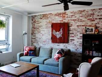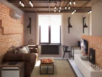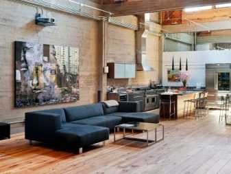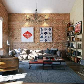 Тем, кого предыдущие два варианта не вдохновляют, стоит присмотреться к стилю лофт. Для него характерны неприкрытые ничем стены, окна панорамного типа и ограниченное количество мебели. Чтобы декорировать такую гостиную, применяют абстрактную живопись, черно-белую фотографию и даже торшеры из металла.