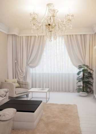 - Классика более торжественна и роскошна, характерными чертами ее являются насыщение белым цветом, употребление хрусталя, позолоты, резных элементов. В классическом формате дома используются также лепные детали, арки, могут ставиться колонны, иногда подвешиваются рельефные карнизы. Над окнами крепятся тяжеловесные даже на вид гардины, дополняемые идущей вертикально драпировкой — подхваты при этом должны быть сделаны как можно привлекательнее.
