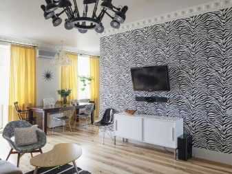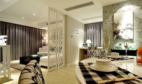 Визуальное структурирование пространства также может проводиться фальшивыми перегородками, арками, выделением различных по оформлению частей потолка. На помощь оформителям иногда приходят еще декоративные конструкции, подиумы и шторы. Разделение при помощи обоев хорошо тем, что никакие дополнительные элементы вам не понадобятся в принципе.