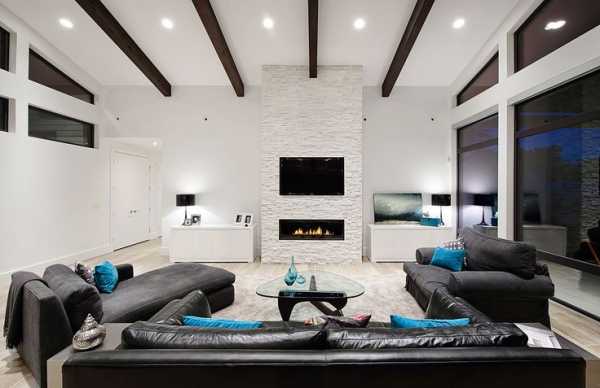 - В другой гостиной видим два окна, поставленных на разных стенах и довольно удаленных друг от друга; но это расстояние скрадывается, и пространство не кажется затемненным. Оригинальный дизайнерский манёвр — насыщенный темный угол, отделяющий два светлых участка стены. Потолок белоснежный, кроме центрального фигурного светильника на нем установлены точечные источники света