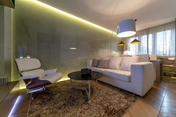 Даже простая подсветка по периметру может значительно изменить восприятие помещение: сделать его выше и просторнее, добавить воздуха и объема.