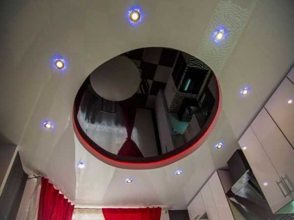 Круглая форма может использоваться в как в одноуровневых конструкциях, так и в многоуровневых. В первом случае — круг спаивается с общим полотном. А во втором — круглая конструкция может выступать или быть утопленной в основном полотне.
