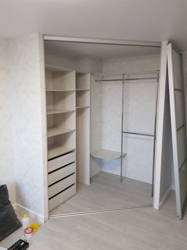 Угловая гардеробная. Шкаф пятиугольный, пятистенный. Гардеробная Г-образная. Гардеробная встраиваемая. Гардеробная раздвижная с дверями купе. Угловой шкаф-купе двухдверный.