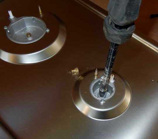 Очень важно обратить внимание на диаметр и шаг резьбы на форсунке, что бы она точно подошла и выполняла свою функцию в полной мере. Как правило, в комплекте форсунок – 5 шт., если плита 4-х конфорочная и 3 шт., если плита 2-х конфорочная. Замену форсунок лучше доверить специалисту газовой службы, но если вы все, же отважились поменять форсунки сами, то вам понадобится торцевой ключ, отвёртка и возможно плоскогубцы. Как правило, что бы найти где же эта форсунка, нужно снять крышку с горелки плиты ( круглая, чёрная крышка), под крышкой вы увидите рассекатель горелки, внутри которого должна виднеться форсунка (см.фото).