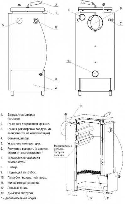 | Марка | Тип / Мощность (кВт) | Тип камеры сгорания | Площадь обогрева (м²) | Максимальная температура воды (˚С) |